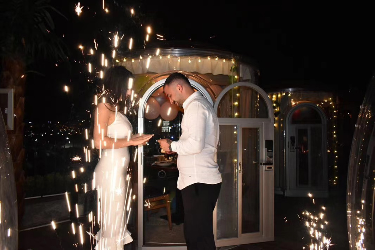 The clear dome restaurant with a diameter of 2.1 meters. The room can accommodate 2-3 people. This is a small dome restaurant, suitable for use in outdoor environments such as roofs, terraces, etc. The indoor space is enough for 2-3 people. The fully transparent dome design will not create any sense of depression, and customers can enjoy the surrounding beautiful scenery while dining. The products are cost-effective, and the owner can recover the investment cost in a very short time.
