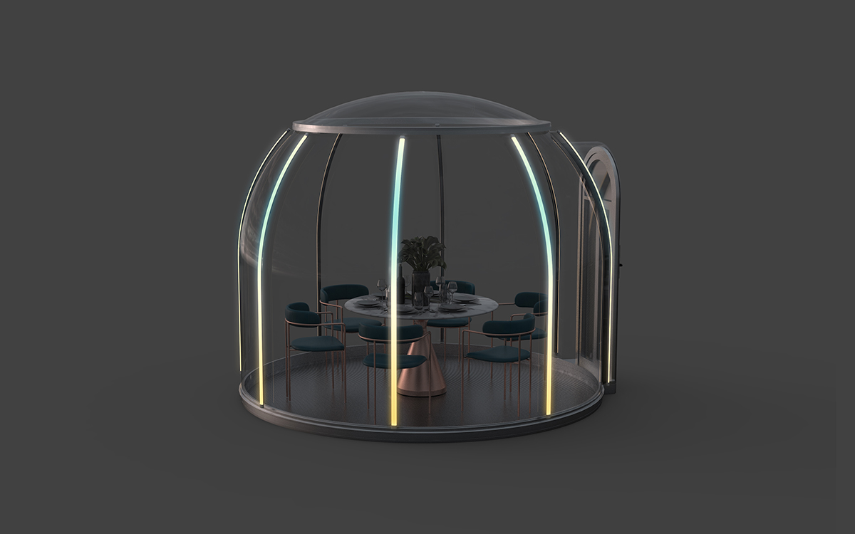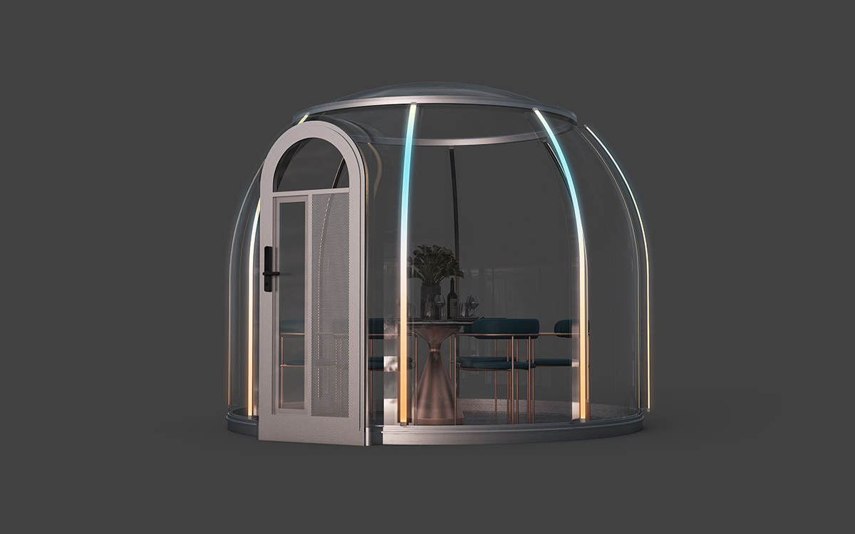 A dome restaurant with a diameter of 3.0 meters. The room can accommodate 5-6 people. This product is highly cost-effective. The overall strength of the spherical design is very high. It is suitable for seaside, terrace, roof and other environments, and has a good wind resistance effect. The product material is made of polycarbonate imported from Bayer, Germany, which is 100% isolated from ultraviolet rays, non-toxic and odorless, and users can have a comfortable experience indoors. The transparent dome has excellent thermal insulation performance and is suitable for outdoor environment restaurants in winter, allowing users to enjoy a warm dining experience while enjoying the surrounding scenery.