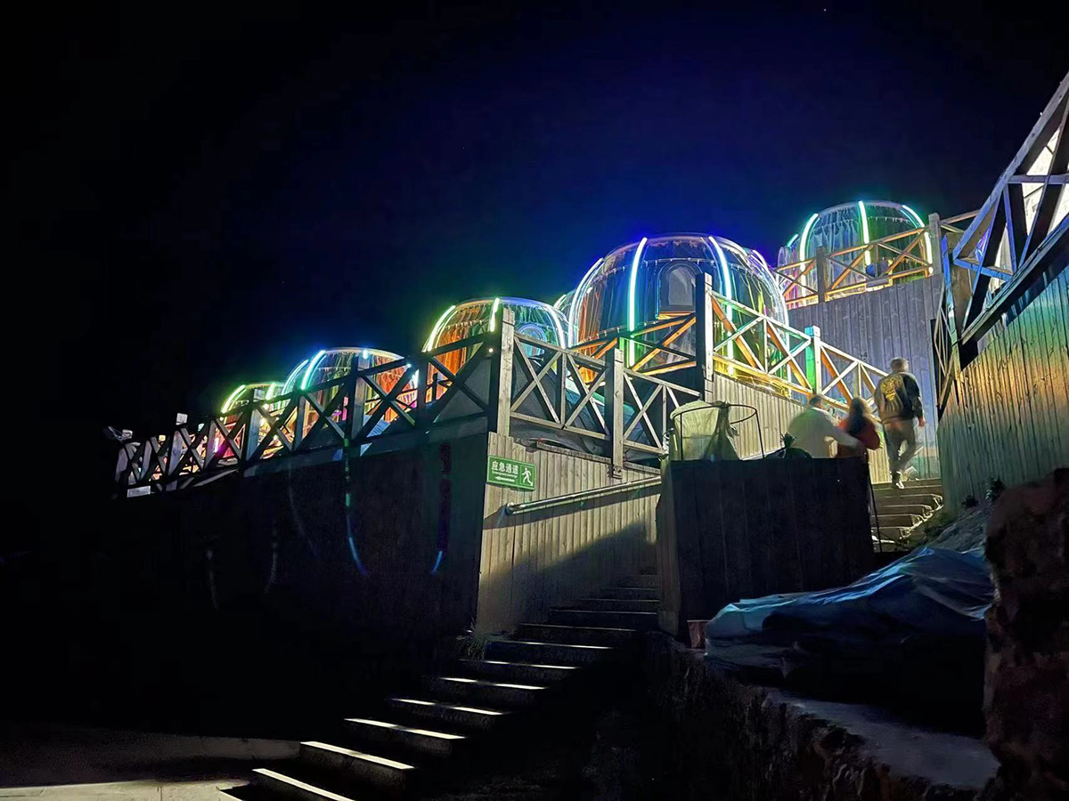 Transaprent camping dome with a diameter of 3 meter. With 360° transparent design, users can enjoy the beautiful scenery in the natural environment while they are indoors, such as sunrise, sea of clouds, sunset; The main body of this clear dome is composed of 8 pieces of polycarbonate sheets. The splicing place is tile-shaped lap joint, and the structure is waterproof ; An additional milky white tape design is used at the splicing of the PC sheet to ensure the sealing of the product and prevent mosquitoes and ants from entering the room; The integrated aluminum alloy door has high strength and long service life outdoors, and the doors and windows can be integrated with 304 stainless steel mesh to ensure ventilating, and the mesh can also prevent outdoor mosquitoes. RGB ambient lighting is integrated on the outside, when at night, the product itself is a small landscape. A 1.5M bed can be placed in the camping dome, which is suitable for two adults. Compared with traditional small tents, it has a more comfortable and characteristic camping experience. Compact design, suitable for use in scenic spots where the site is not too wide, and the owner can use limited area as much as possible and place more rooms.